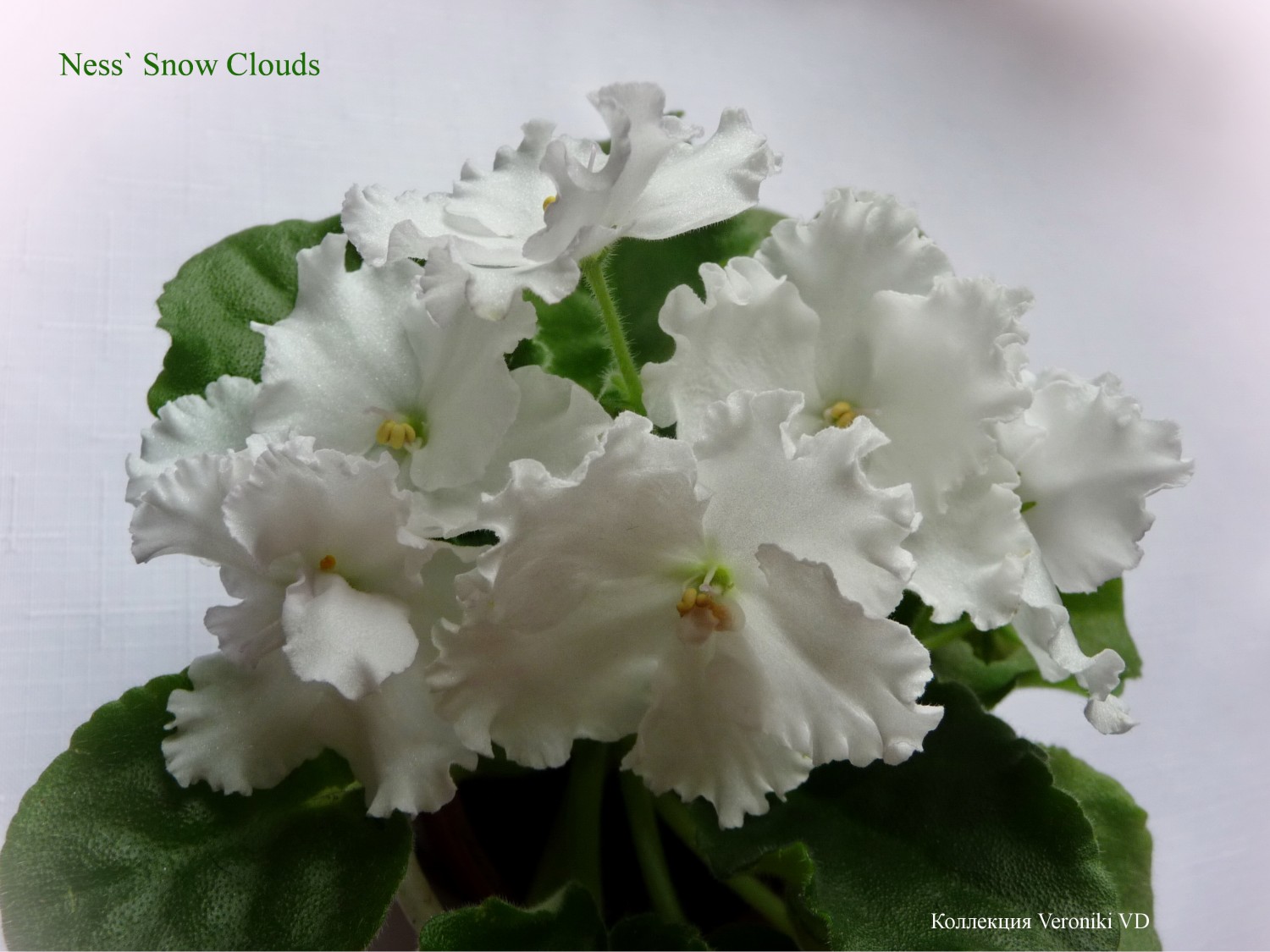 | Ness' Snow Clouds (8146) 01/19/1995 (D. Ness) Semidouble white large ruffled pansy. Medium green, quilted, scalloped. Standard Огромные простые и полумахровые волнистые белоснежные цветы на розетке из ярко-зеленой стеганой листвы.
