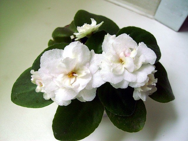 | Lollipop (J. Gehr) Double white/yellow eye. Medium green, plain. Miniature Миниатюра с очень крупными цветами. Белый, густо махровый цветок имеет интенсивный желтый центр и слегка волнистые, "изрезанные" края лепестков; светло-зеленая, овальная стеганая листва.