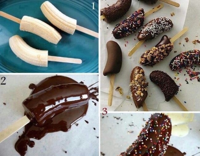 Обмакните банан в растопленный шоколад, посыпьте топингом и отправьте в холодильник на час. Простой и вкусный десерт готов.