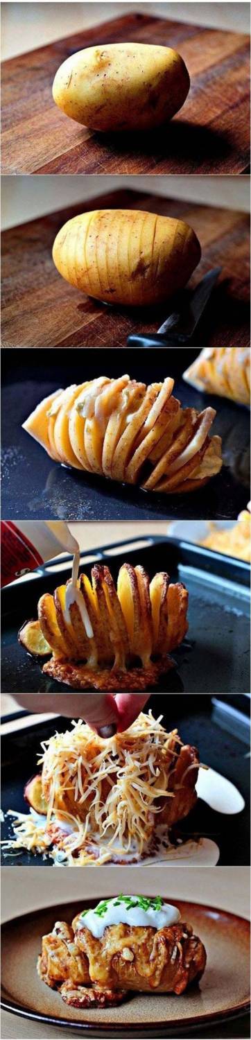 | Сделайте надрезы на картофелине, заполните сыром, соусом, беконом или другими продуктами по вкусу. А затем запекайте в духовке.