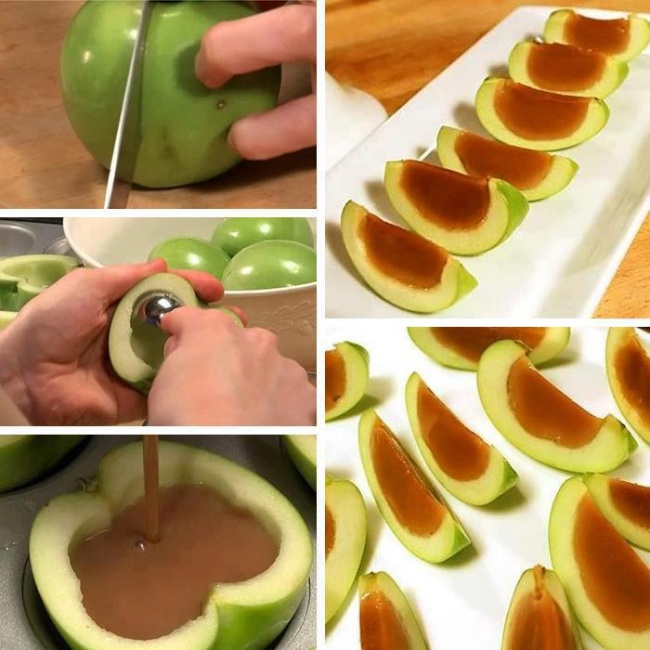 Вырежьте у яблока сердцевину, залейте карамелью, поставьте в холодильник. Понравится и детям, и взрослым.