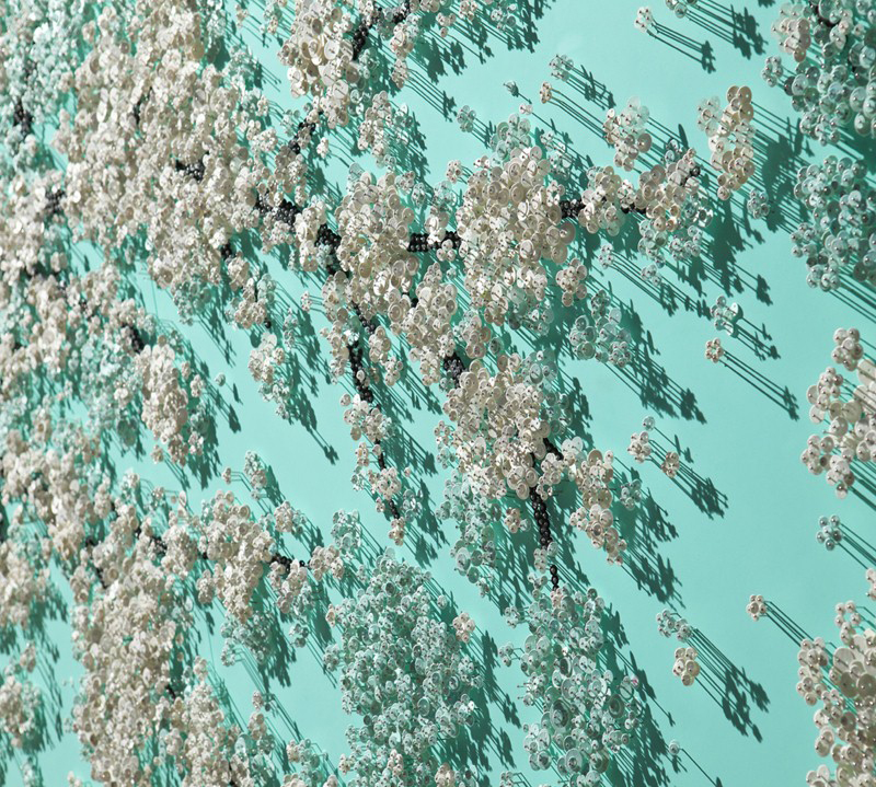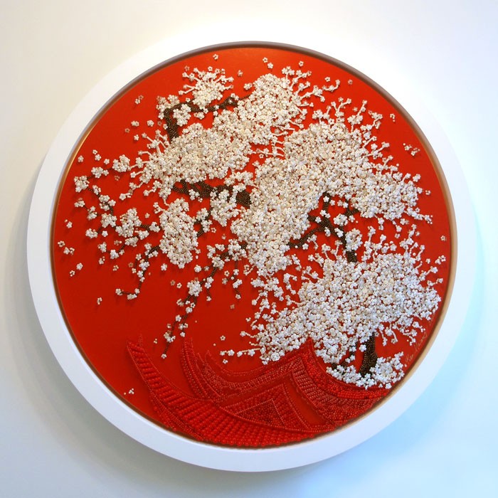 На создание этой серии работ ее вдохновила цветущая сакура. Картины созданы при помощи пуговиц, бусин, булавок, бисера и тонкой проволоки