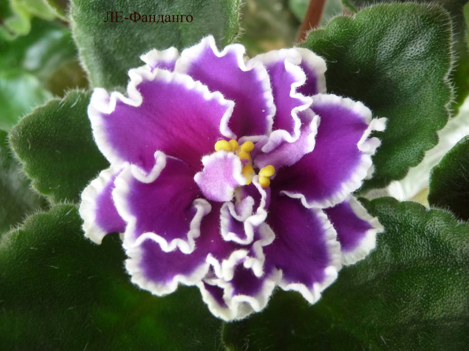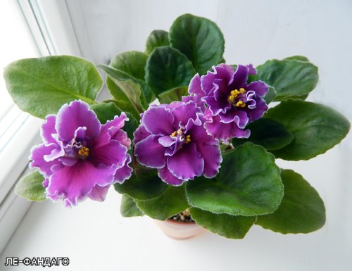 | Крупные темно фиолетовые с бордовым оттенком полумахровые и махровые звезды с волнистыми краями лепестков и белой каймой. Среднезеленая аккуратная розетка.