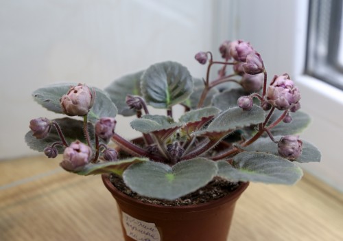| TV-Жемчужина Нила (Т. Высота) Цветы - жемчужины. Необычные махровые с чашевидными лепестками, пепельно-розовые цветы с серебристым напылением снаружи и коричневато-зелёные изнутри. Ровная компактная розетка средне-зелёных листьев. Стандарт. Сорт для любителей вечноцветущих. ( описание автора)